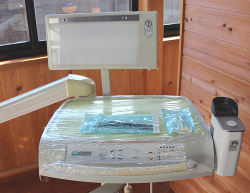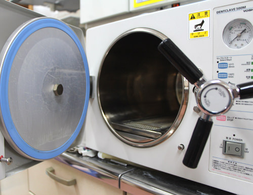 基本セット(ピンセット、ミラー、短針、エキスカベータ―、練成充填器)及び口腔内に入る器具(タービン、コントラとよばれる歯を削る器具、白い詰め物を詰める器具、かみ合わせをチェックする器具、仮歯を外す器具、根管治療測定器の頬に付ける器具)に至るまで数を多くそろえ、患者さんごとに洗浄、滅菌処理をしています。